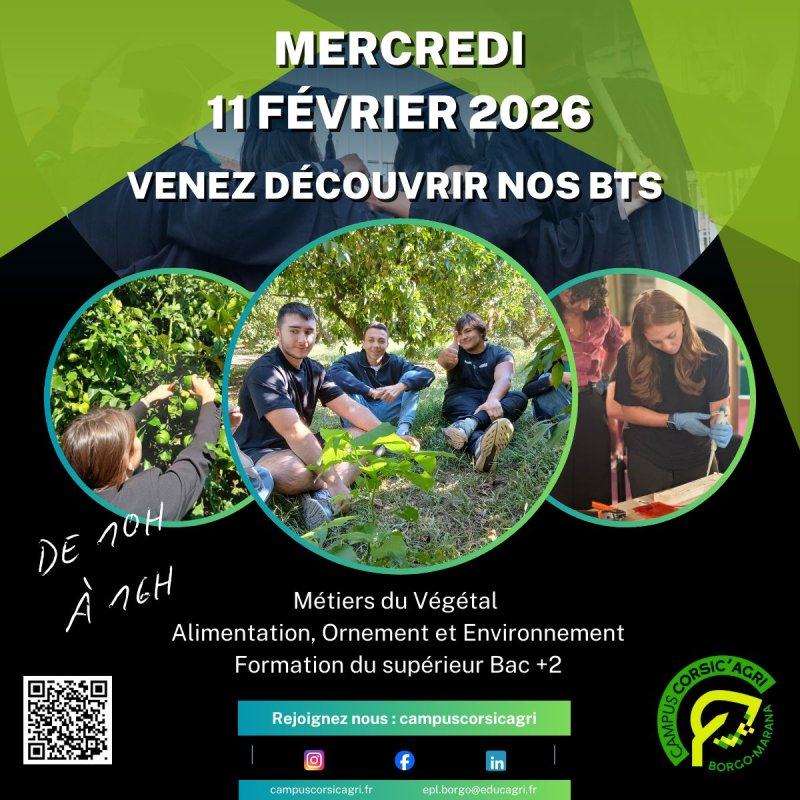 Dans le cadre des Journées Portes Ouvertes 2026 de l’EPLEFPA de Borgo-Marana, le Campus Corsic’Agri invite collégiens, lycéens et leurs familles à découvrir le BTSA Métiers du Végétal – Alimentation, Ornement, Environnement, lors d’une journée dédiée le mercredi 11 février 2026. Une occasion privilégiée de s’informer sur les formations de l’enseignement agricole et les perspectives professionnelles offertes par ce diplôme de niveau Bac +2.